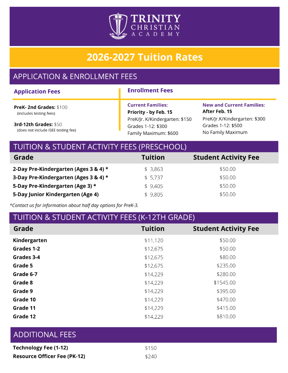 A: For each grade level, we have calculated the costs for the various activities that require funding above and beyond tuition, such as grade-level feasts, retreats, overnight trips, social events, testing, and school functions. Rather than “nickel and dime” parents throughout the year for these various activities, we are now “bundling” them together into one fee that can be paid out in convenient monthly installments along with tuition. These are not new fees but a way for us to be more transparent about all the costs associated with attendance at Trinity and offer parents an easier way to pay for them throughout the school year by bundling them and spreading them out.