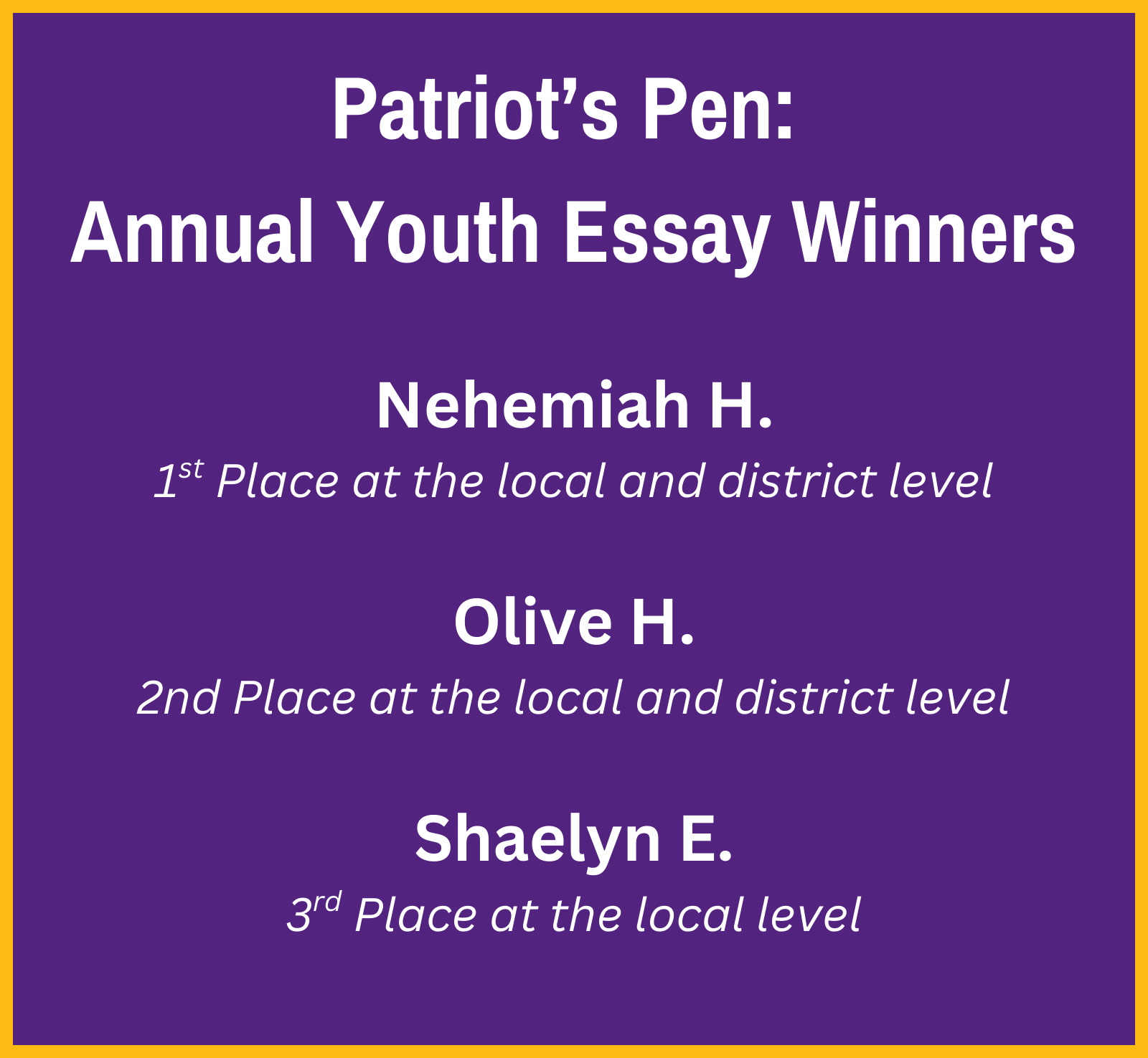 Congratulations to Nehemiah H. (1st place), Olive H. (2nd place), and Shaelyn E. (3rd place.). Nehemiah and Olive also placed first and second at the district level and will continue on to regionals.